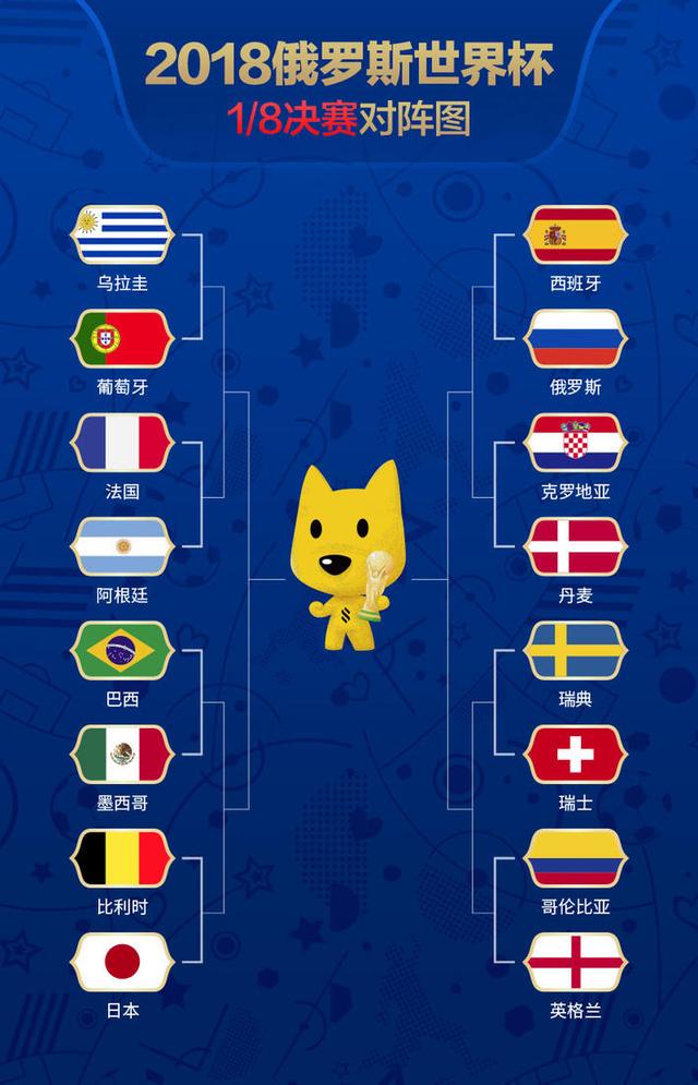 下半区则由俄罗斯对垒西班牙,丹麦对垒克罗地亚,瑞士对垒瑞典,英格兰对垒哥伦比亚。