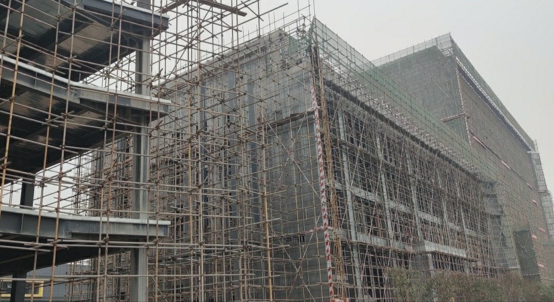 2月13日上午,大年初二,内江国际物流港白马园区建设现场飘起了小雨,抵挡不住工地上建设的火热势头。在园区的内江保税物流中心(B型)项目工地上,主体已经完工的海关办公大楼矗立,建筑被密密麻麻的钢筋脚手架“包裹”,内部传出震耳的电钻冲击的声音。