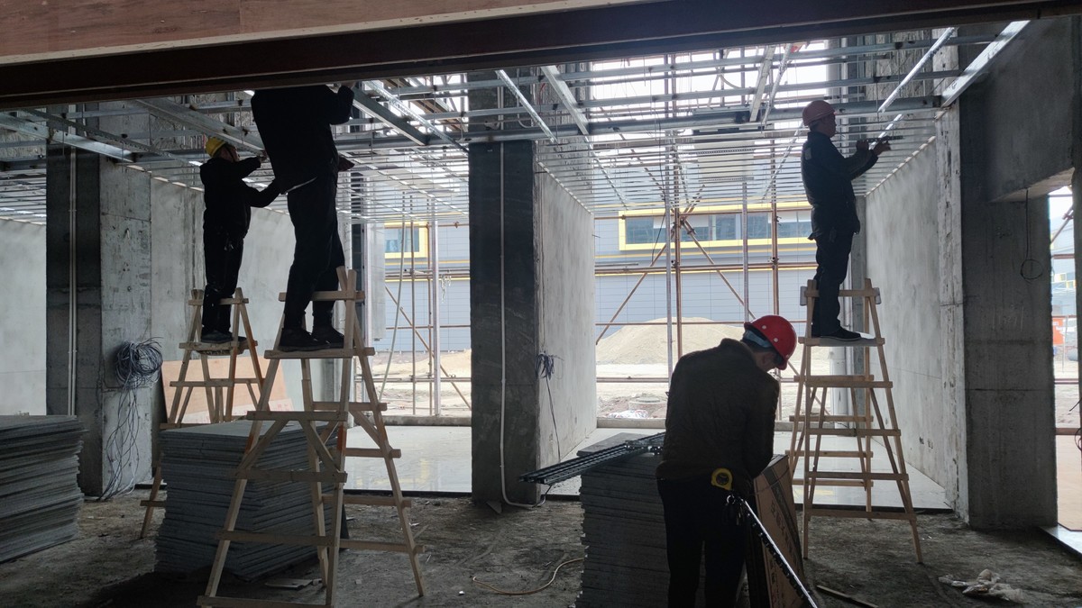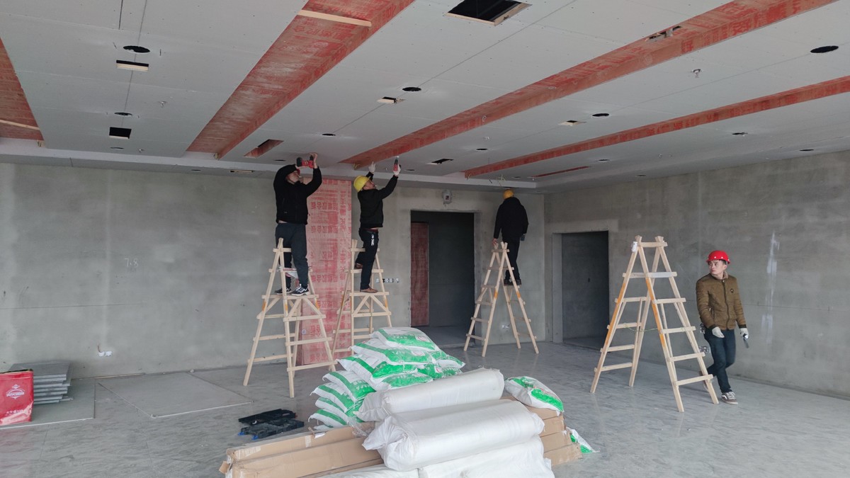 “我们正在进行海关办公大楼内部装修工作,虽然是春节假期, 依然有50多位工友坚守在岗位上。”木工组组长彭小波一边告诉记者,一边抽出手来用电钻拧紧楼层天花板上的螺丝。“这个地方建好后是个两百多平米的海关会议室,肯定会很气派。”