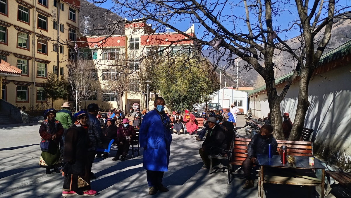当天上午,马尔康市阳光灿烂,无风。老人们分批到院坝里晒着太阳。