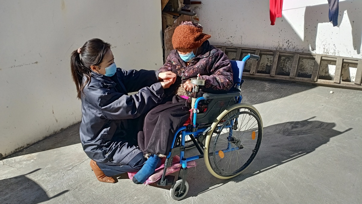 “你冷不冷?”2月14日上午,在阿坝州马尔康市马尔康镇俄尔雅村的马尔康市敬老院,院长格西王姆蹲下身子用手试探正在轮椅上晒太阳的呷斯姐的手是否温暖,呷斯姐连忙缩回手,并发出叫声。“你的手太凉了。”呷斯姐说,然后与格西王姆聊起话来。