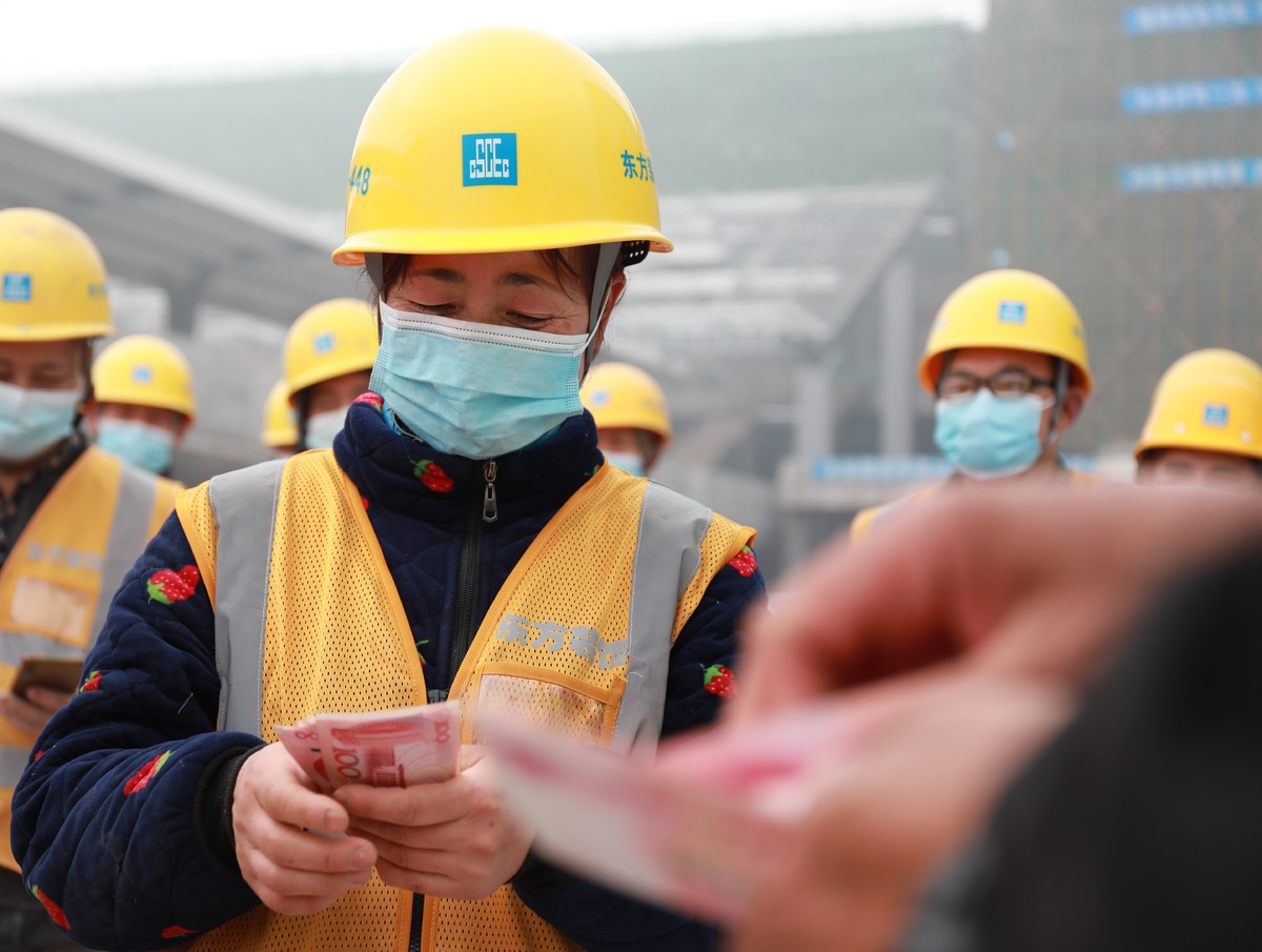 春节期间,川南城际铁路泸州站站房及相关工程项目上,一线工人们领取春节补助费。汪静摄