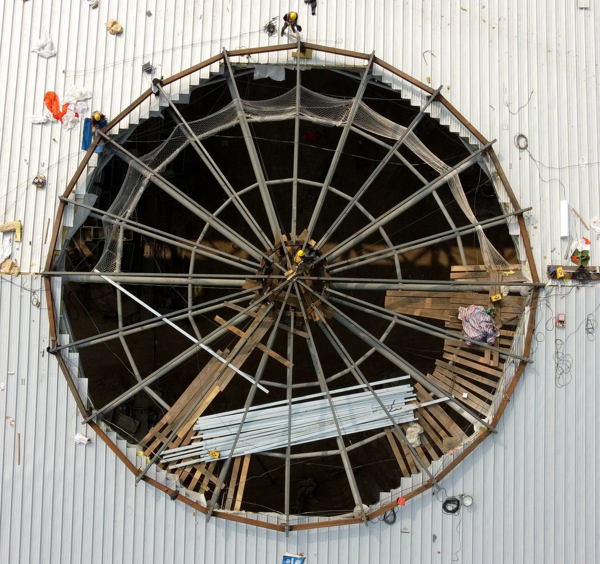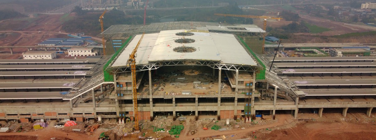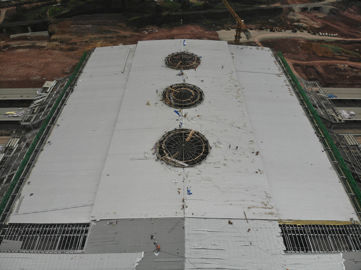 航拍泸州高铁站,春节期间站房顶部正在进行外幕墙装设施工。中建三局集团有限公司泸州高铁站房项目部供图