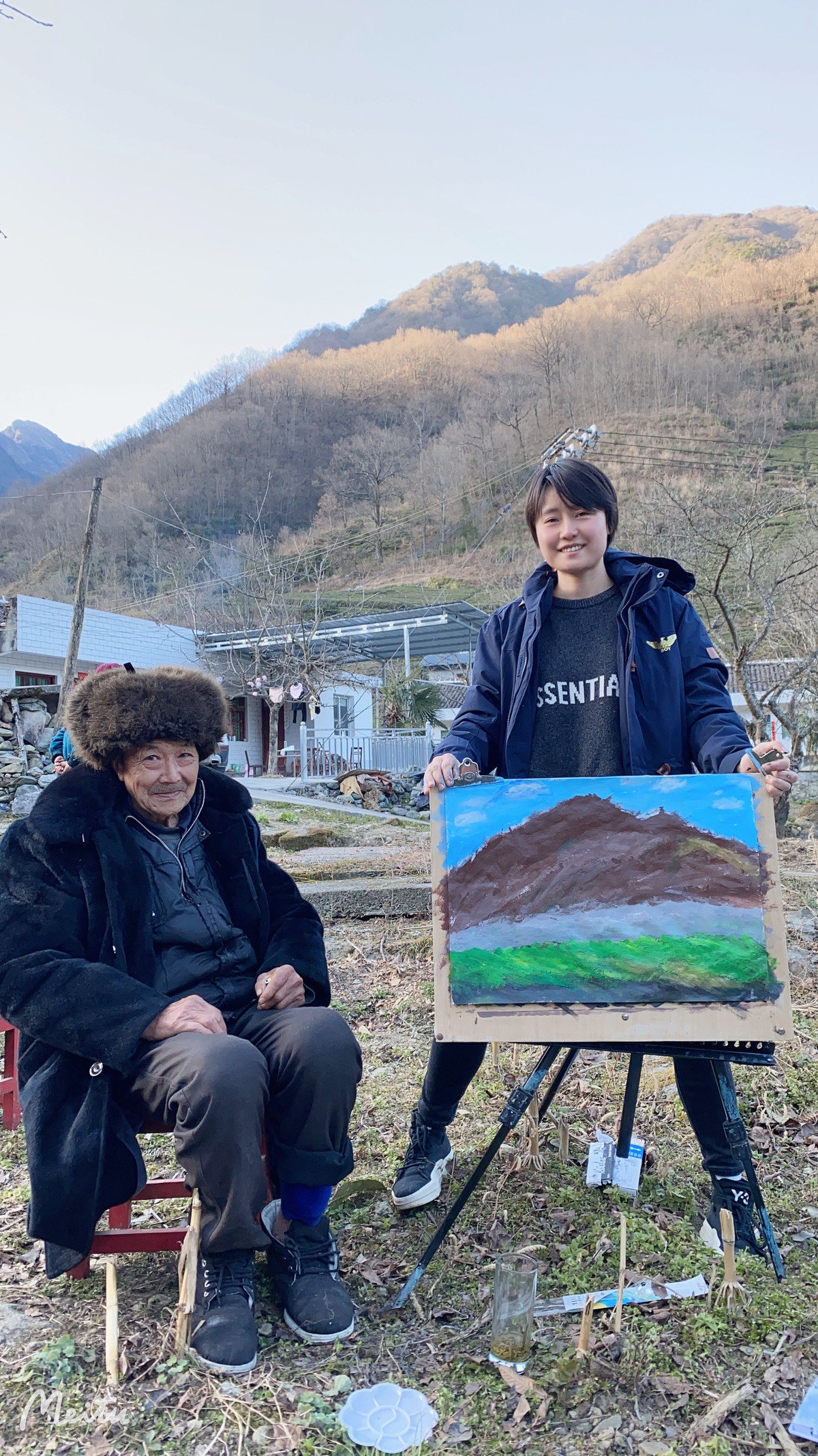 “阳光很好,直接就开始画了。”从没学过画画,这次过年画画是赵海伶最享受的事情。偏僻的山村很少有人来这里画画,在农户家门口画就更难得了。正是过年,来来往往村里有很多人围观,其中一位,还是给赵海伶养蜂的80多岁的爷爷,陪着她坐了一下午。赵海伶用了2个多小时完成了一幅画,问老人看懂自己画的是什么了吗?老人说看懂了。