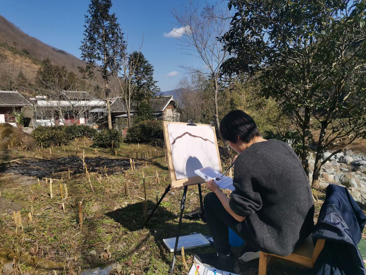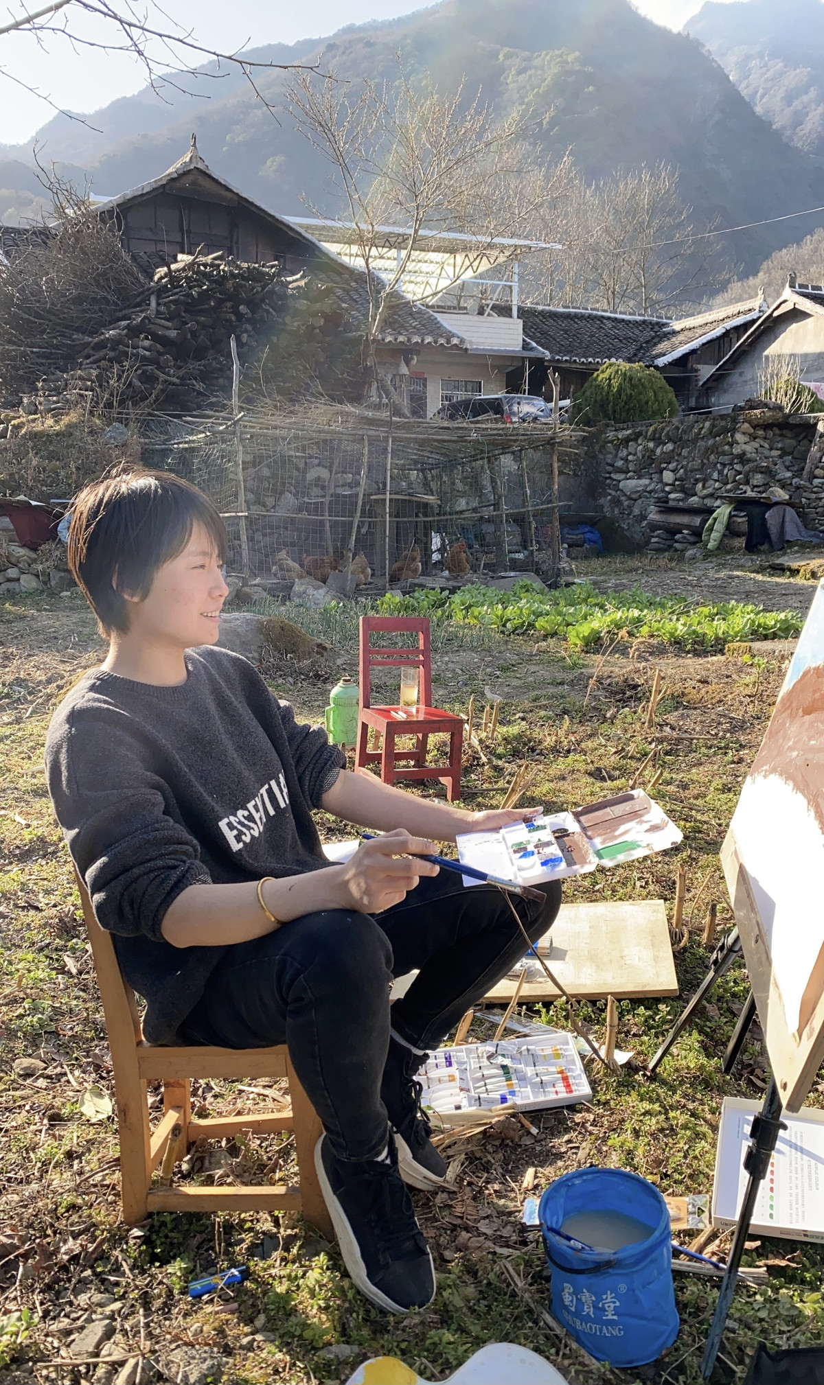 大年初二,拿着画画老师送给自己的4块画板,赵海伶跟弟弟走到广元青川附近的“李子坝”,一下午都在乡下画画。