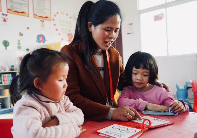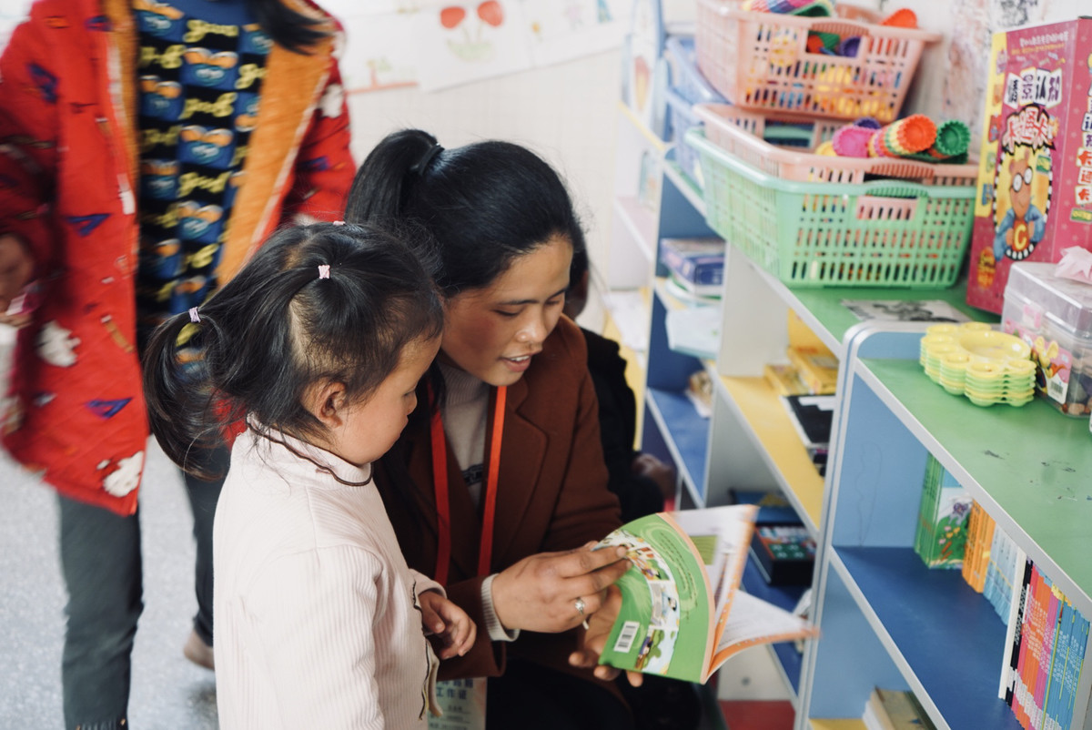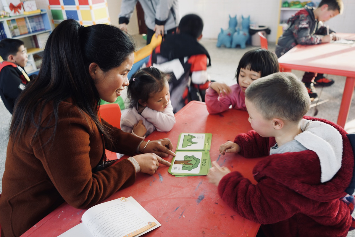 张春艳在在村里的童伴之家教孩子看图识字。魏冯摄。