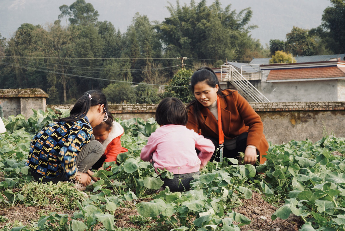 张春艳和孩子们干一些简单的农活。魏冯摄。