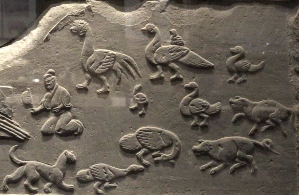 接下来就是酿酒的“大场面”:只见排列整齐的酒缸就有5个之多,缸边有人赶着牛车正运粮而来,有女子从井中提水,然后是一组酿酒流程图,包括了炊煮、酿造、发酵,最后香甜的酒液被倒进陶缸之中。在酿酒图的四周,还刻画了许多鸡鸭鹅以及猫狗一样的动物,浓郁的生活气息扑面而来。