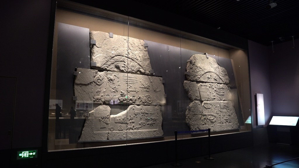 最上面的一组俨然成都平原的风光:远山连绵,狩猎者正在追逐野鹿,张开的弓箭犹如满月,野鹿飞奔的姿态十分灵敏轻捷。山下水流潺潺,鱼戏水中,天空掠过飞鸟。