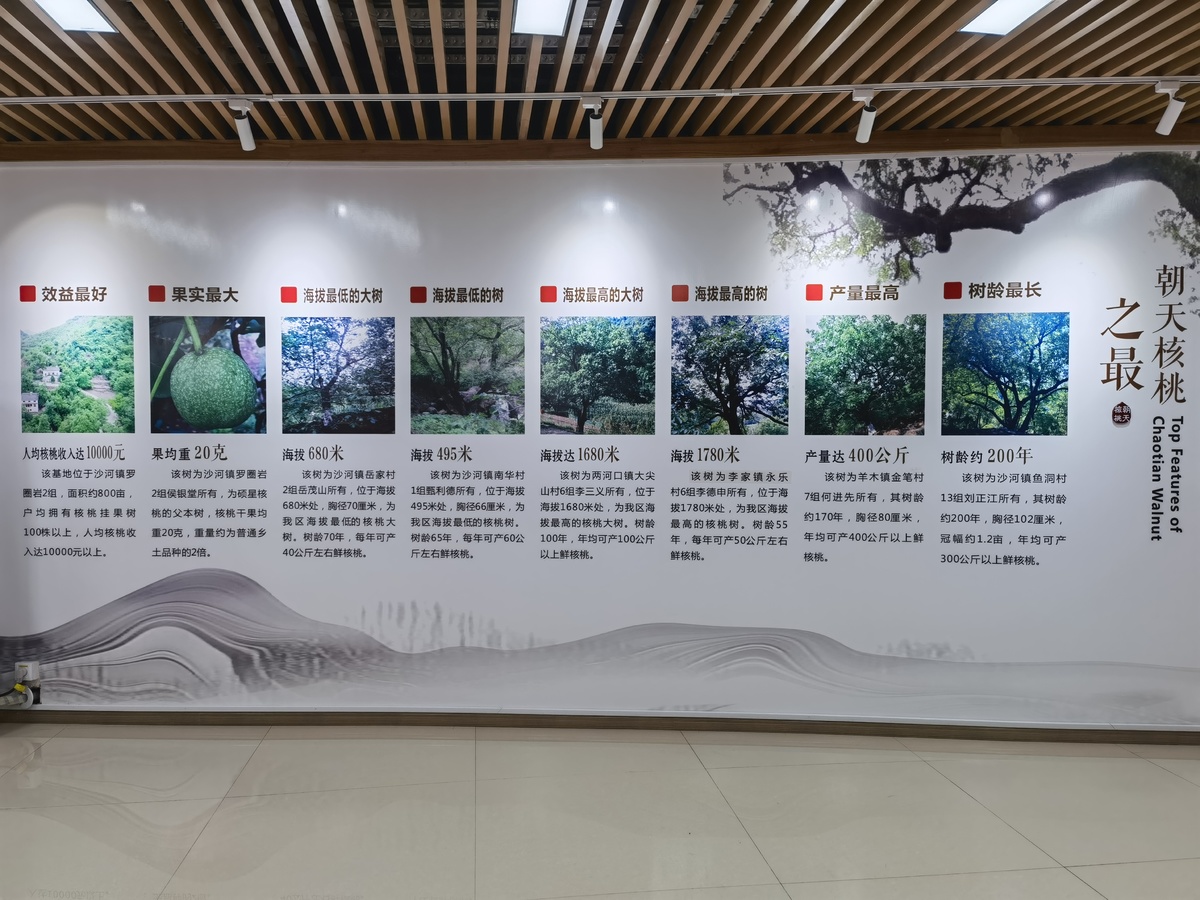 朝天核桃博览馆,地处川陕交界的七盘关,占地面积1500余平方米,由序厅和五个展厅组成,共六个展厅。
