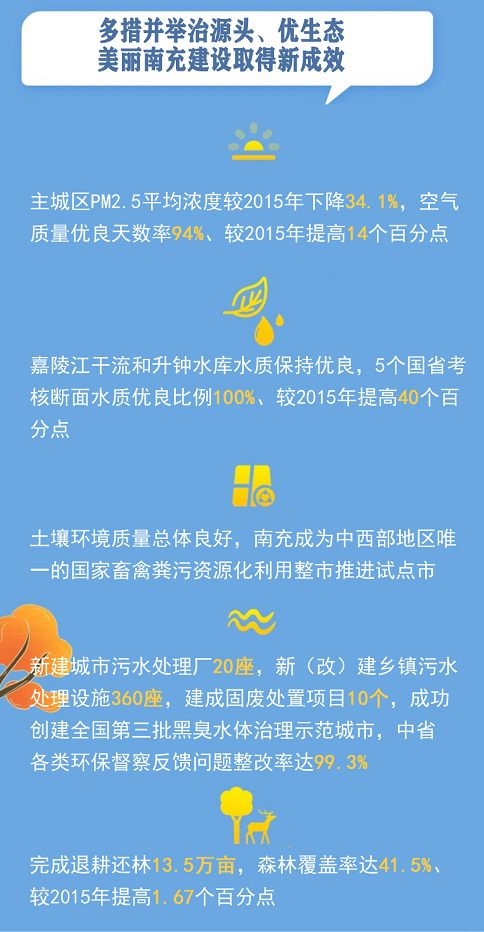 “十三五”期间,南充的空气质量、水质都有显著提升。南充主城区PM2.5平均浓度较2015年下降34.1%。5个国省考核断面水质优良,比例100%。南充成为中西部地区唯一的国家畜禽粪污资源化利用整市推进试点市。新建城市污水处理厂20座,新(改)建乡镇污水处理设施360座,建成固废处置项目10个。
