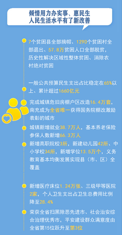 社会保障水平持续提升,城镇新增就业38.7万人,基本养老保险参保人数新增66.3万人。成功创建四川省第五届文明城市、第十一届双拥模范城。新增高职院校3所,新建幼儿园42所、中小学校34所,新增学位13.5万个。新增医疗床位1.24万张、三级甲等医院2家。平安建设群众满意度由全省第15位跃升至第3位。