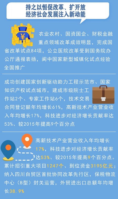 过去五年,南充完成国省改革试点84项,公立医院改革受到国务院办公厅通报表扬。圆满完成新一轮政府机构改革和乡镇行政区划调整改革。成功创建国家创新驱动助力工程示范市、国家知识产权试点城市。建成市级院士工作站2个、专家工作站6个。