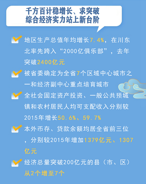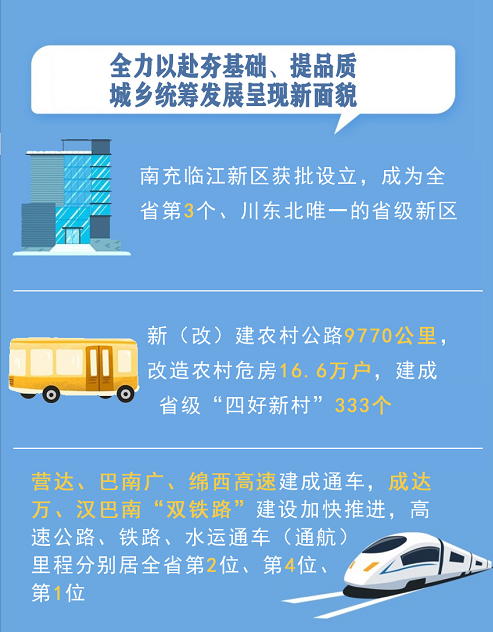一大批城乡基础设施建成投用,从交通出行和生活娱乐方面提高民生品质。北湖公园等15个城市公园、滨江大道等57条城市干道新(改)建全面完成。新(改)建农村公路9770公里,改造农村危房16.6万户,建成省级“四好新村”333个。营达、巴南广、绵西高速建成通车,成达万、汉巴南“双铁路”建设加快推进。高坪机场年旅客吞吐量突破百万人次,阆中机场加快建设,嘉陵江航道达到Ⅳ级通航标准,高速公路、铁路、水运通车(通航)里程分别居全省第2位、第4位、第1位。