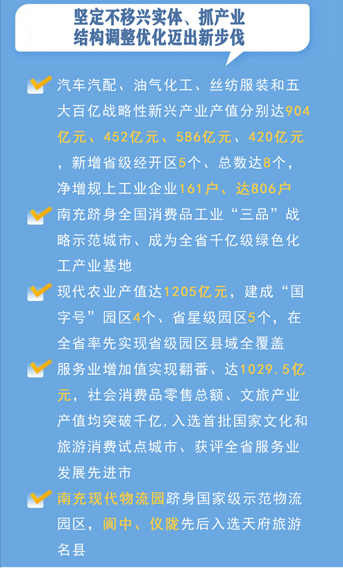 工业发展方面,南充新增省级经开区5个,总数达8个,净增规上工业企业161户、达806户。同时,南充跻身全国消费品工业“三品”战略示范城市、成为全省千亿级绿色化工产业基地。