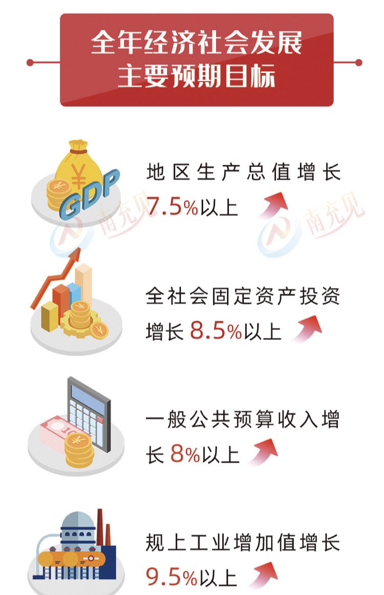 “2021年全市经济社会发展主要预期目标为:地区生产总值增长7.5%以上,全社会固定资产投资增长8.5%以上,一般公共预算收入增长8%以上。”2月18日,南充市第六届人民代表大会第六次会议召开,会上发布政府工作报告,提出以上目标。