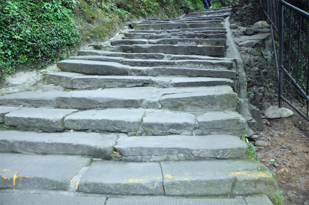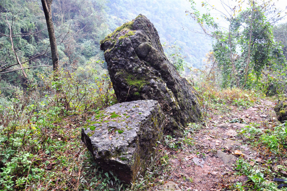 调查人员发现,这些古道多就地取材用红砂石砌成,“山坡及山脊处多用石板铺成,下坡易塌方的地方,就在原岩上凿出斜面铺石板,或干脆直接在原岩上凿出阶梯。”茶马古道主要运送货物,为使其坚固耐用,有的古道底部还垫夹了碎砾石或碎红砂石土层。在大邑西廊村的一段古道,两侧几乎已被蔓延的荒草覆盖,路基阴暗处也随处可见青苔。不过道路的荒废反而让路边的歇脚石和拴马石幸运保存了下来。歇脚石由一块整石简单剖就,一旁的拴马石,却从石头中间掏通了一个小洞。过往客商在此拴好马匹,便能在一旁歇脚了。