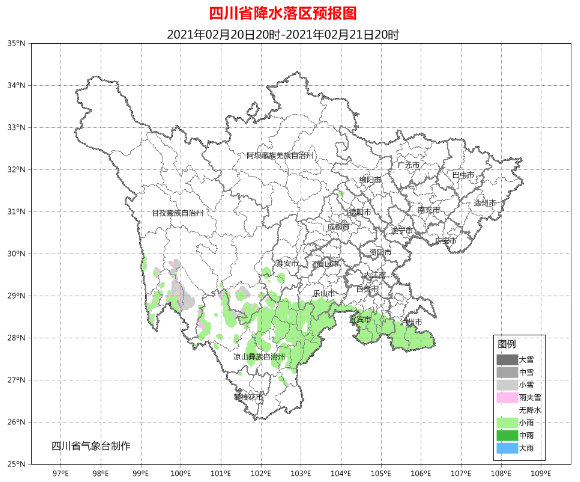 预计今天(2月20日)白天,全省各市州以多云间晴天气为主,其中凉山州北部、甘孜州南部有分散阵雨(雪)。