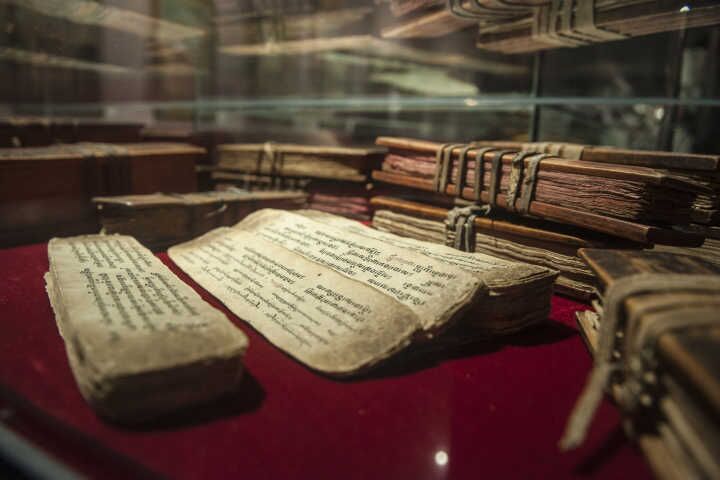 在展览现场,摆放着一些格萨尔的藏文文献资料,与传统汉语古籍装帧不同,藏文典籍主要采用梵夹装形式,俗称长条本。此次展出的包括格萨尔梵夹装的手抄本、伏藏本、木刻本以及近六十年来正式出版的各种图书等等,囊括了数百部格萨尔王史诗。
