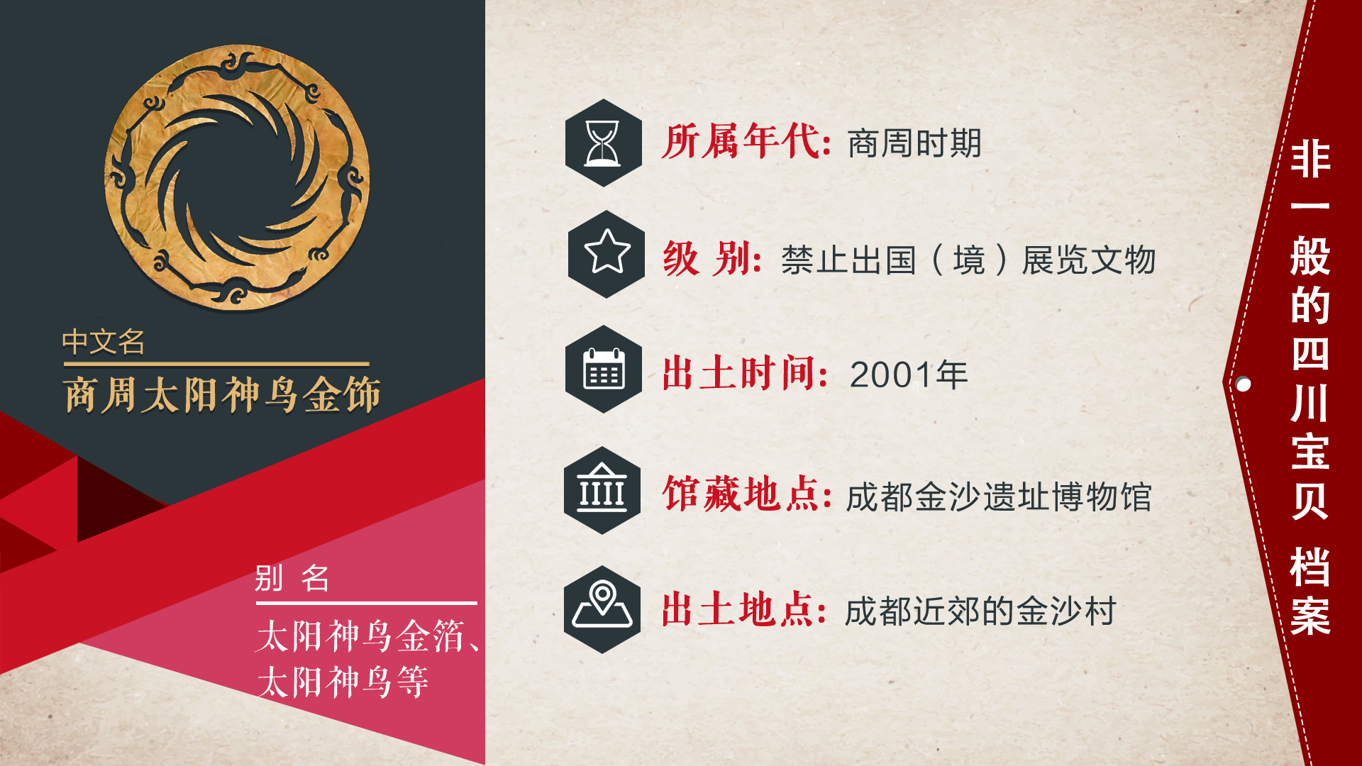 四只展翅飞翔的神鸟围绕着太阳生生不息、循环往复的飞翔,寓意深远,它不仅是是古代人民深邃的哲学宗教思想、丰富的想象力的体现,更是非凡的艺术创造力和精湛工艺水平的完美结合,是古蜀黄金工艺辉煌成就的代表。