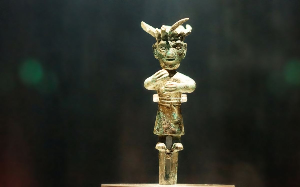 事实上,在金沙遗址里还有很多体现这种信仰的文物,比如青铜立人头上戴着太阳帽,俨如光明的使者或太阳神的化身。