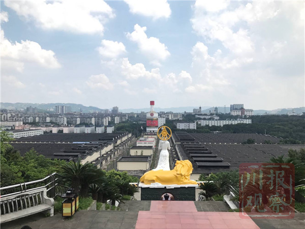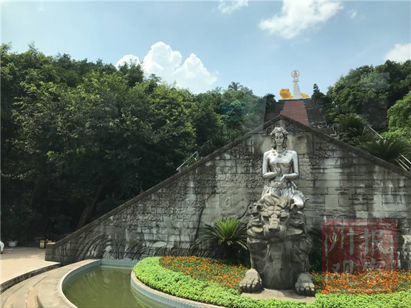 头顶五粮液品牌标识“桂冠”,身着缀满高粱、麦穗等谷物的长裙,上半身赤裸,单手捧着一个酒坛,脚下踩着通体金黄的一头雄狮。7月26日,“大江奔流——来自长江经济带的报道”来到宜宾五粮液集团酒圣山,半山腰上,一尊巨大的白色“酒圣”雕像坐落在祭祀台上,吸引了不少人注意。