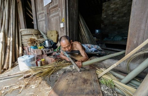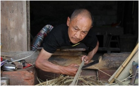 2月21日早晨,开春后的山乡笼罩着淡淡的薄雾。在乐山市市中区悦来乡道华村, 70岁的李佰洲手里握着一把篾刀,一大早就从堂屋爬到门槛边,头朝外趴着开始劳作:他把竹子剖成一根根篾条,然后用其他阴干后的篾条编制箩筐。“同罗万生约好了的,今天要来买一批竹编产品。还有一些货要赶出来。”他对记者说。