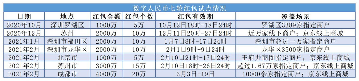 在成都进行此番试点之前,已经有深圳、苏州、北京3个城市进行了6轮红包试点,总金额为1.1亿元。加上成都此次4000万元试点金额,数字人民币红包试点金额已经达到1.5亿元。