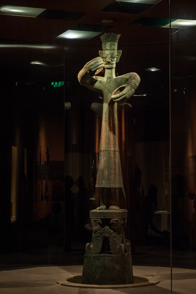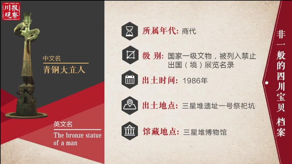 几年之后,一尊高达1米8(加上高台通高2米62)的青铜大立人重新站了起来。他就是"永久禁止出国参展"的国宝级文物----青铜大立人像。这件距今有3000多年历史,世界上同期现存最高、最完整的青铜立人像,被誉为“东方巨人”。