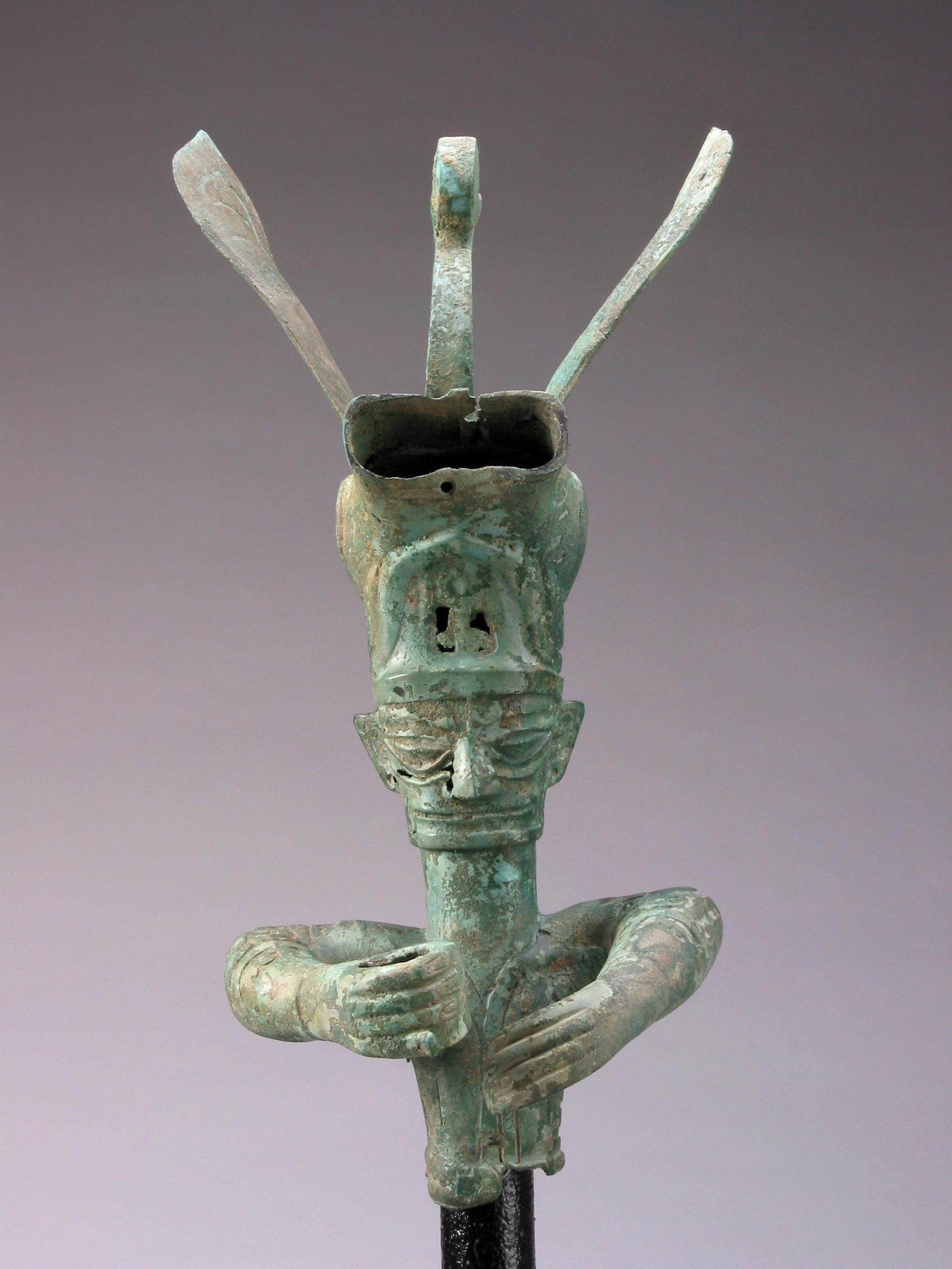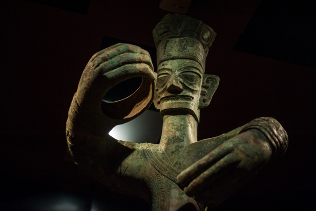 还有人认为手握木蛇,因为操蛇是古代巫觋的象征。有的则干脆认为其实立人像手中什么也没有拿,这种管环状手势,其实象征的就是立人手握日月,完全有掌管蜀国命运的能力……