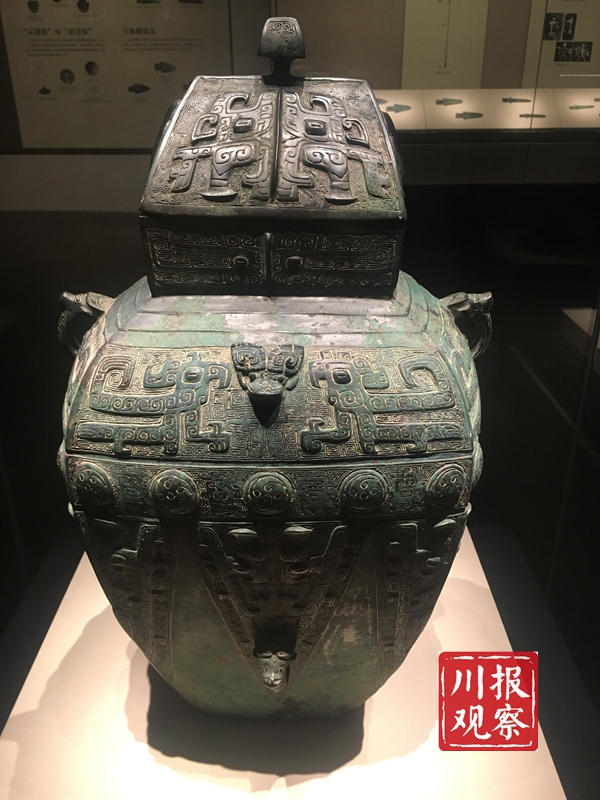 龙纹小铜罍:来自宝鸡青铜器博物院。上世纪五十至八十年代,四川彭县竹瓦街陆续出土9件铜罍,其中6件与此罍造型相似。装饰繁复的盔形器盖,器身的兽面、夔龙、云雷等纹饰,无一不显示着两地的文化联系。
