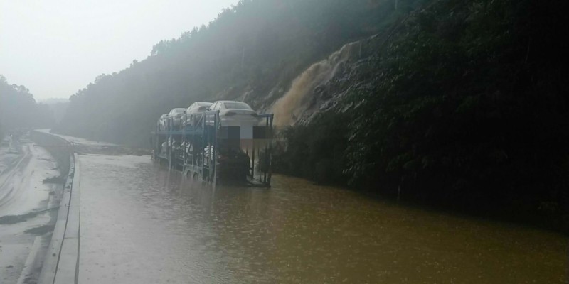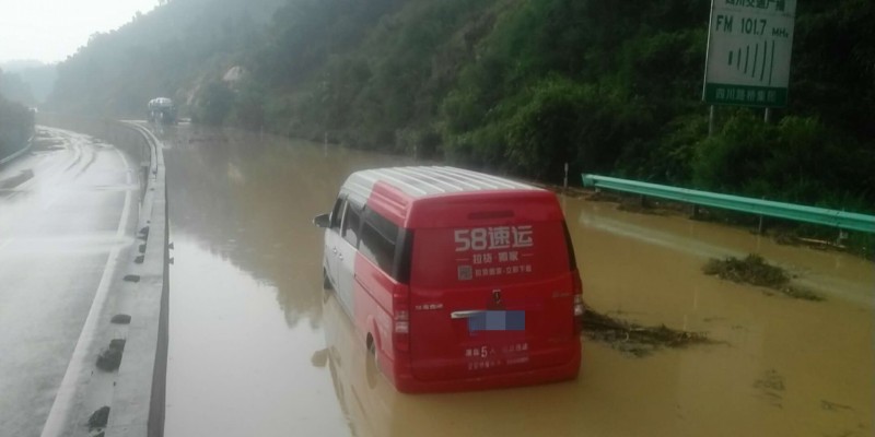 山洪已导致成自泸高速部分路面出现大量积水,车辆完全无法通行。
