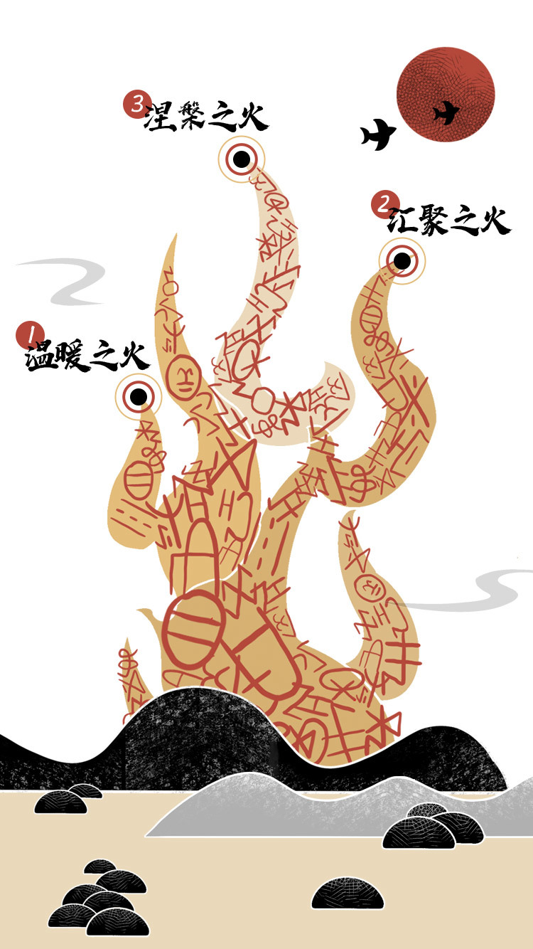 千万年前,先民用火取暖、烤熟食物,开启文明的源头。彝族史诗《勒俄特依》里记载:“为了创造人类燃,为了诞生祖先烧。”