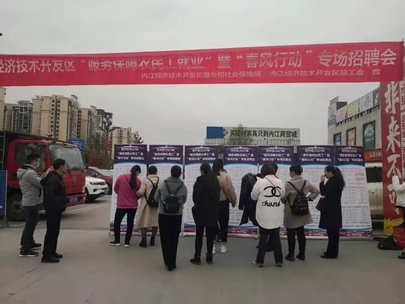 2月25日,内江经开区“服务保障农民工”暨“春风行动”专场招聘会分别在靖民镇综合农贸市场和家居商贸城广场举行。