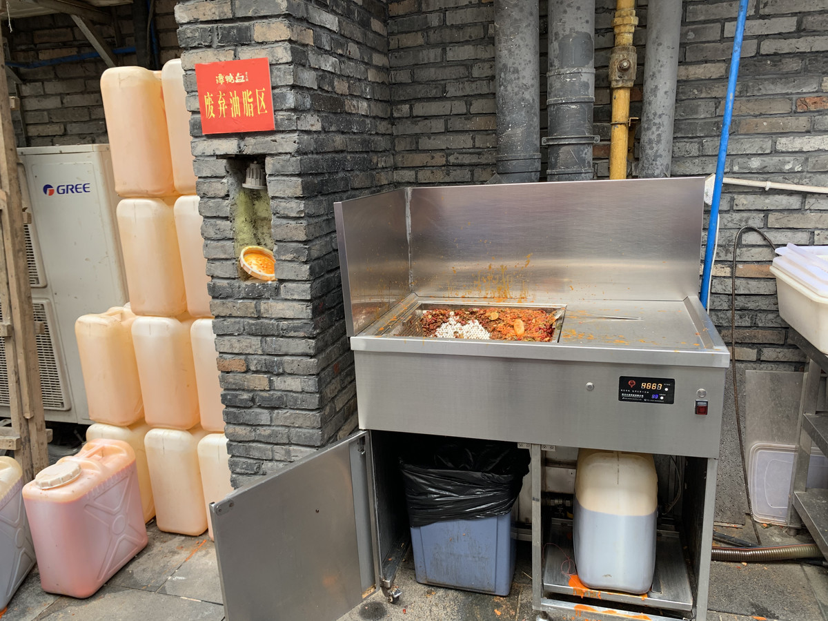 在位于崇德里国际社区的一家连锁火锅店,后门外划出了专门的废弃油脂区,厨余垃圾通过分离机进行干湿分离后盛装,“每天晚上有处理资质的企业会专门来收。”店长说。此外,记者还看到四个蓝色大桶,分别贴有前厅专用、废品专用、可回收垃圾、有毒有害垃圾四种标识,“我们会先分好类,环卫公司每天来收一到两次,瓶子、纸箱等也可以卖废品。”