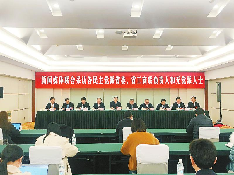 2021年1月31日晚,参加省政协十二届四次会议的各民主党派省委、省工商联负责人和无党派人士代表接受新闻媒体的联合采访。付真卿 摄