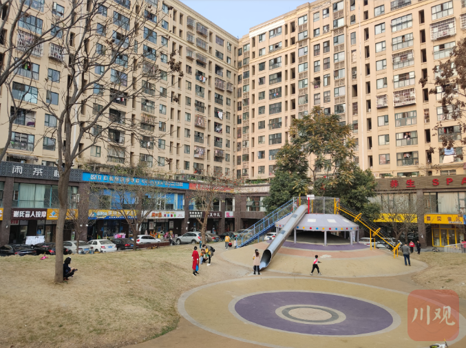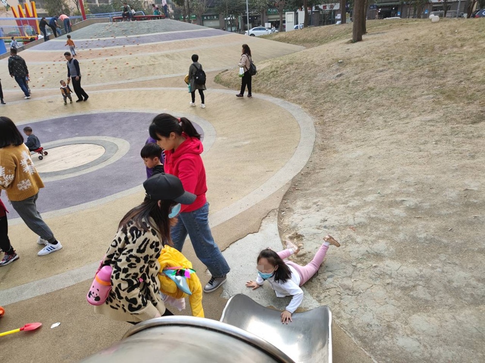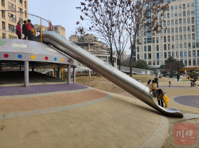 2月23日下午5点过,位于成都市武侯区金履四路和智达二路路口的儿童友好广场满是小孩子们嬉戏玩耍的欢声笑语。整个儿童友好广场一共有3处滑梯,其中有2处都叫“儿童滑梯”,而位于广场东北角的滑梯名叫“探索山丘”,是广场内起始位置最高,坡度最陡,长度最长的管状滑梯。