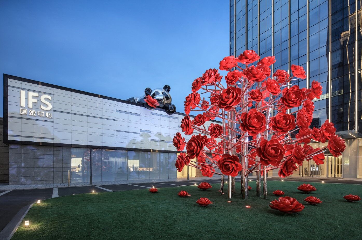 据川报观察记者了解,“LOVE.FOUND.”艺术装置从构思到完成落地,历时300余天。山茶花树由钢铁树干和100朵红色玻璃钢山茶花组成,树高6.5米,重约16吨,置于重庆IFS三楼户外花园的东北侧绿地;熊猫身长12米,重近7吨,镜面不锈钢造的身体,其表面可像镜子一样映射周围空间的轮廓和外界的缤纷变化,让城市环境融入作品之中。