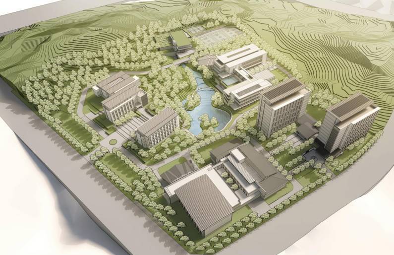 项目在设计上利用现有地形,充分保留山地地形特色,着力打造环境清幽、布局合理、设施先进、功能完善,将人文与自然、传统与现代融为一体的一流干部教育培训环境。新校区将进一步完善相应的教学功能,并对原有校区资源进行整合利用。