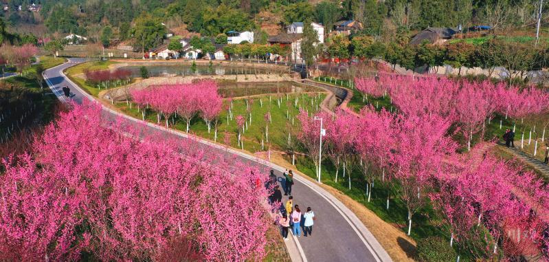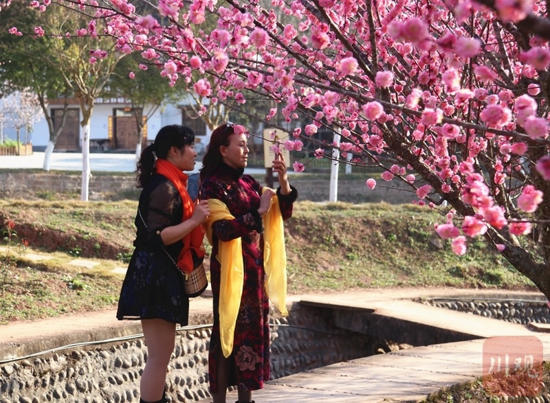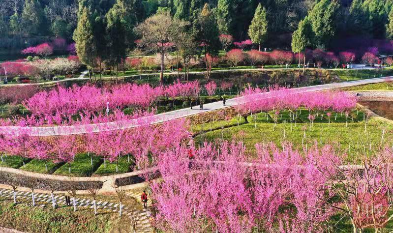 明媚二月,四川西充莲池镇张澜故居景区500亩梅花迎风怒放,粉、红、白三色梅花满山遍野,暗香悠远,吸引了不少市民前来踏青赏花。