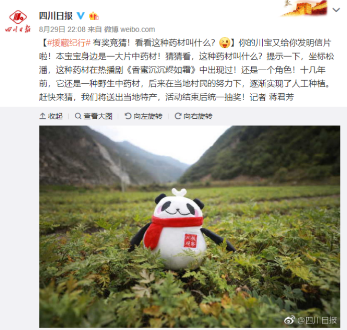 跟着记者,川宝也来到了松潘,还给大家发回了一张名片!一起来猜猜看,照片中川宝周围的这种药材叫什么?赶快来《四川日报》官方微博参与竞猜,有机会获得当地特产!