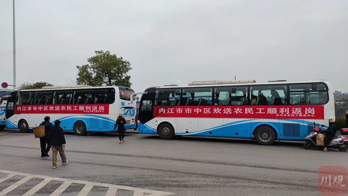 3月2日上午,内江市市中区白马镇恩波广场,市中区农民工外出务工欢送仪式举行。6辆大巴从广场一侧的道路驶出,248名民工乘坐大巴将前往山西太原和长治返岗。