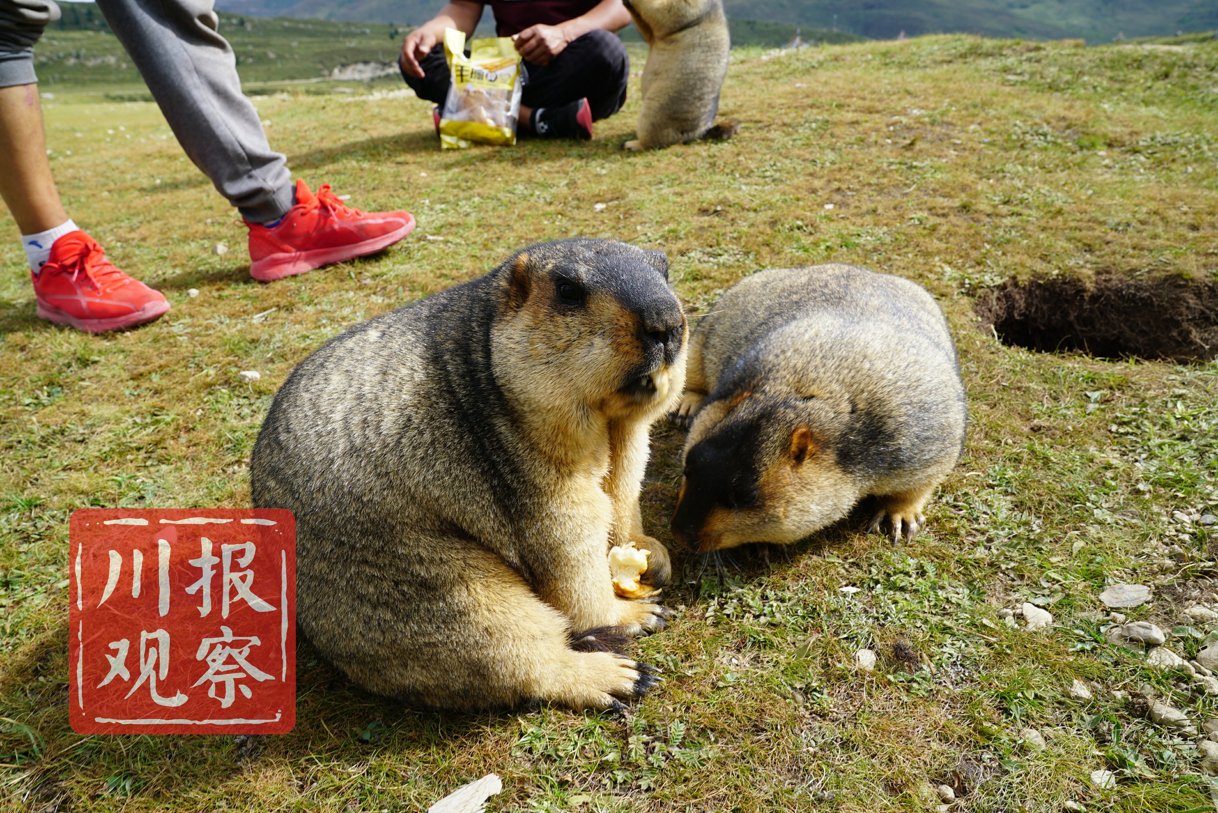 旅途中,游客还可偶遇这片天地的精灵:岩羊、小鹿、松鼠、旱獭、藏雪鸡、雀鸟等。棕黄色的旱獭憨萌,它会站起身子,用两只前腿支撑肥硕的身体,迎接来去匆匆的过客。游客凑过来,它也不惊慌,继续用那双呆萌的眼睛望着你。