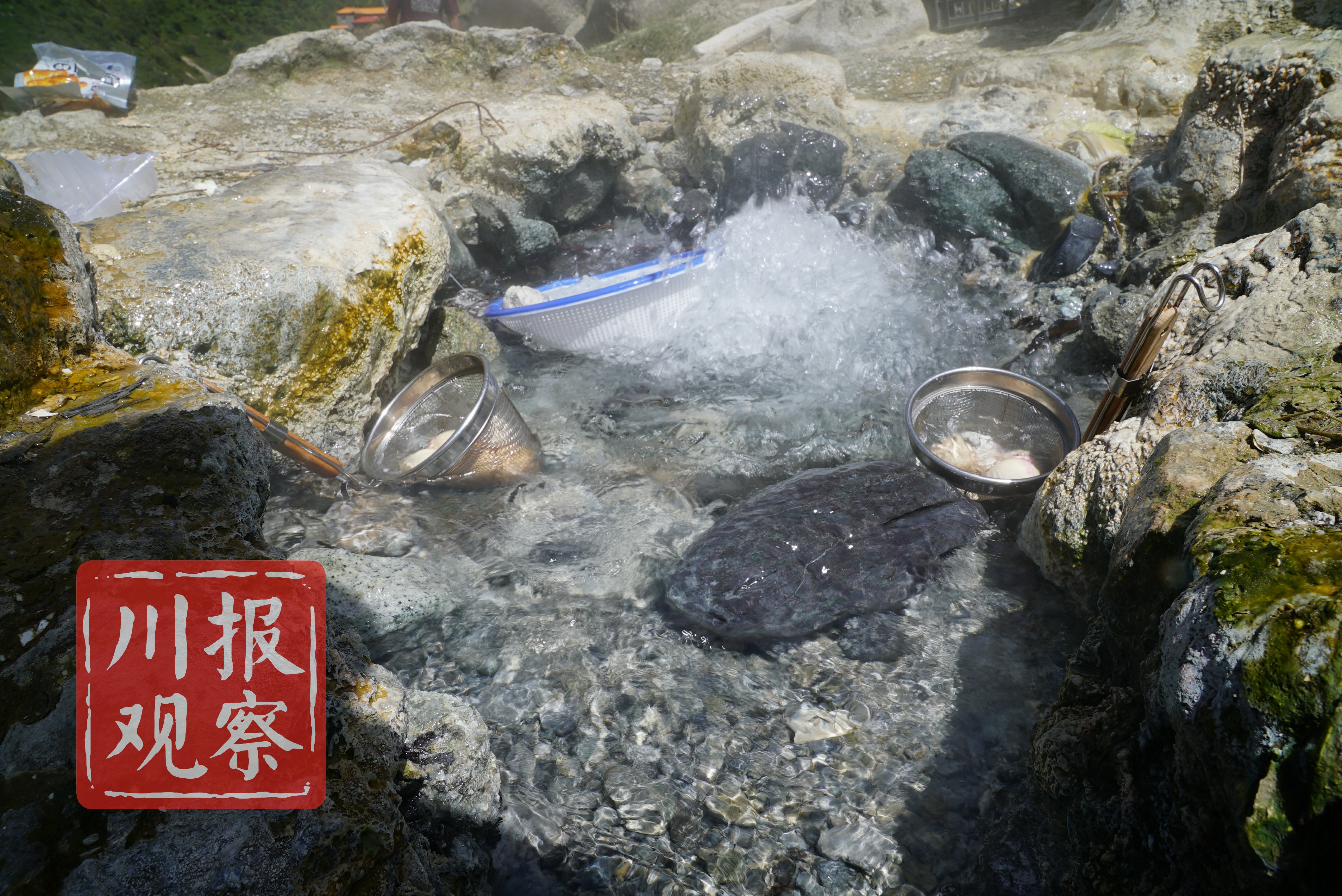 那里遍布着大大小小的温泉坑,腾起一团团热雾。相传,格萨尔王常到此温泉沐浴。“哎……”游客的呼唤声在山谷回荡,山壁上一孔泉眼洞开,吐出腾腾热气,继而,一股温泉喷涌而出,形成一道瀑布。站在仙境般的泉眼下,淋浴,泡脚,别提多享受。