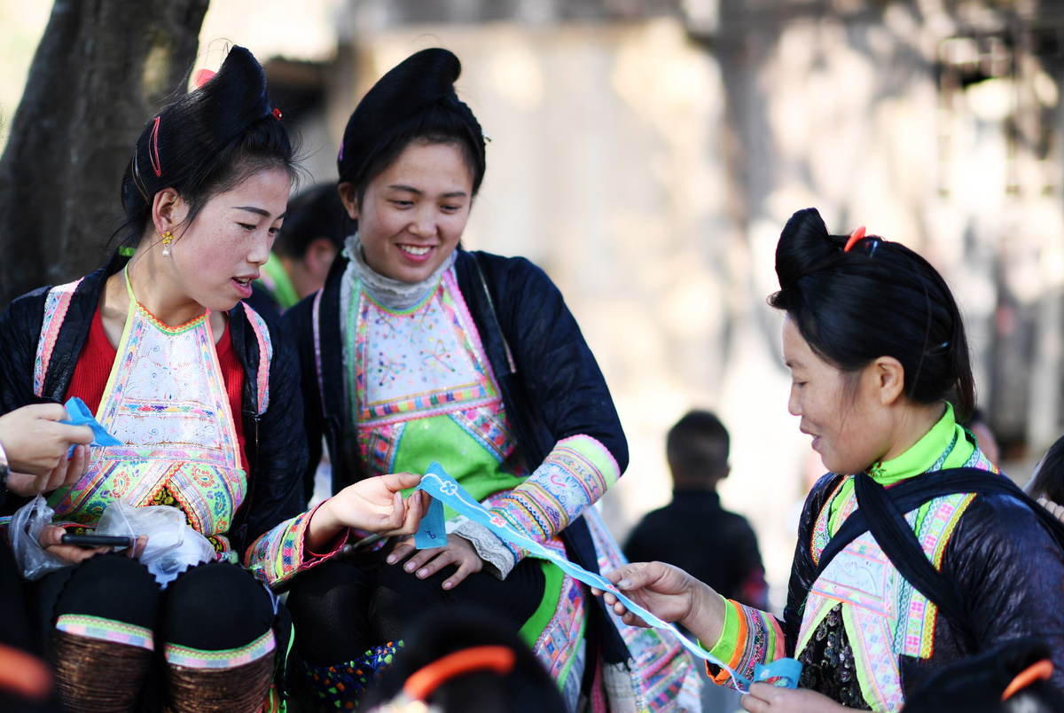 2020年11月13日,苗族妇女在贵州省从江县岜沙苗寨创和刺绣基地学习刺绣。新华社记者杨文斌 摄