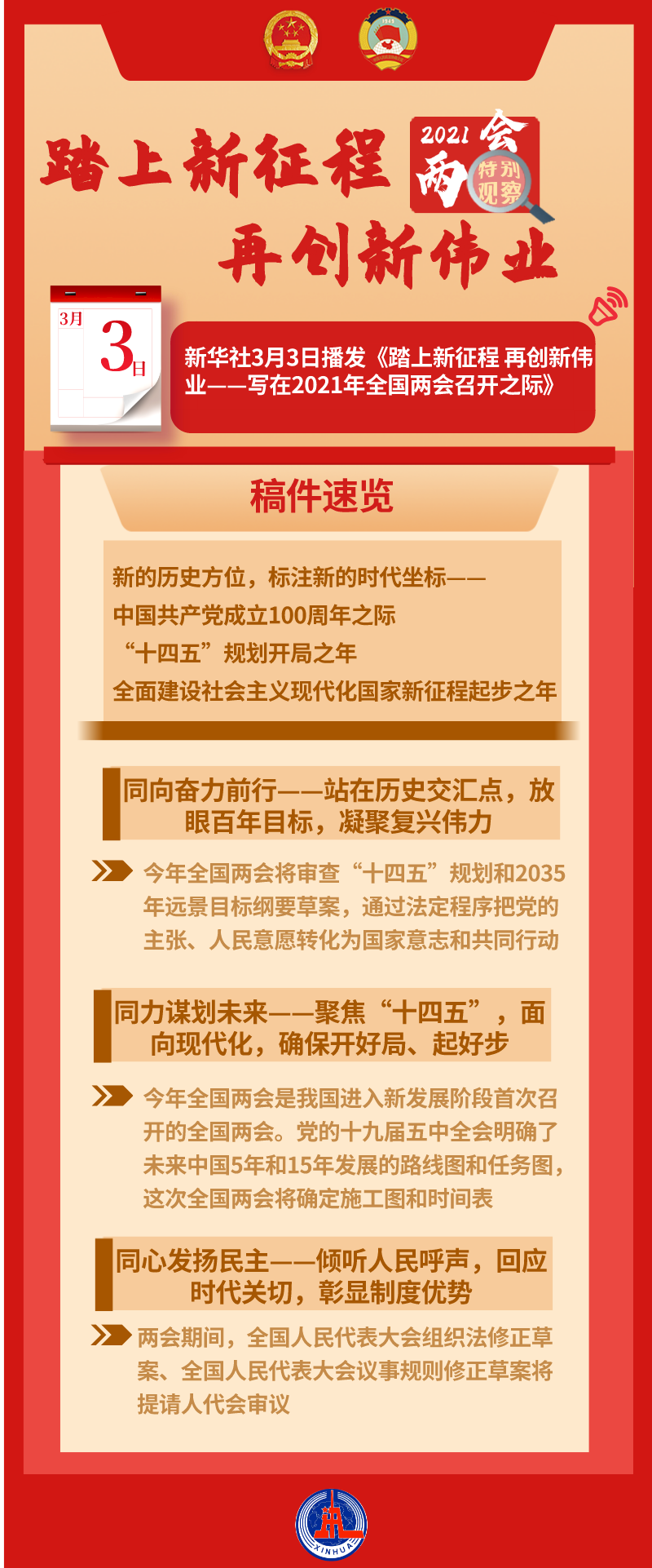 中国共产党成立100周年之际,“十四五”规划开局之年,全面建设社会主义现代化国家新征程起步之年——特殊年份召开的全国两会必将凝聚共识、激发力量,团结亿万人民向着新的奋斗目标进发。