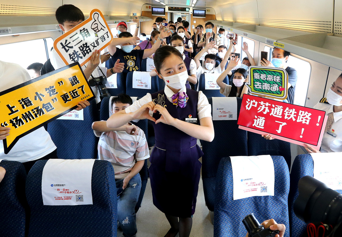 2020年7月1日,C3836次列车乘务员在车厢内为旅客表演节目。新华社记者陈飞 摄