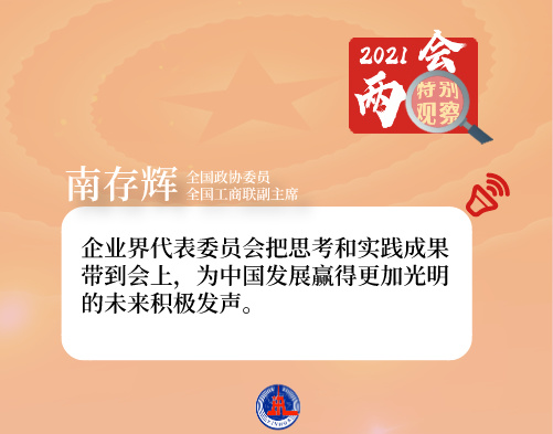他说:“企业界代表委员会把思考和实践成果带到会上,为中国发展赢得更加光明的未来积极发声。”