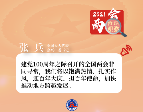 “建党100周年之际召开的全国两会非同寻常,我们将以饱满热情、扎实作风,迎百年大庆、担百年使命,加快推动地方跨越发展。”全国人大代表、嘉兴市委书记张兵说。