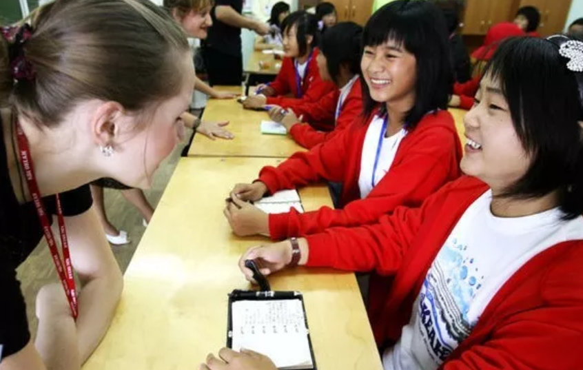 2008年7月22日,在位于符拉迪沃斯托克市郊区的“海洋”全俄儿童中心,俄语陪练(左)陪两名中国学生练习口语。